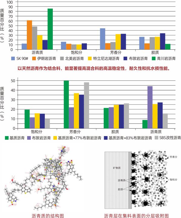 另一方面,由于瀝青裹附于集料表面,其內(nèi)部組分呈分層分布:最靠近集料表面的是大分子量的瀝青質(zhì),其次是膠質(zhì),最外圍是小分子的飽和分和芳香分。天然瀝青中強(qiáng)極性的瀝青質(zhì)含量高,對(duì)集料的吸附力更強(qiáng),因此抗水損和抗剝落能力佳。