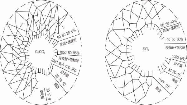 碳酸鈣(堿性石料)與二氧化硅(酸性石料)表面與瀝青交互作用示意圖