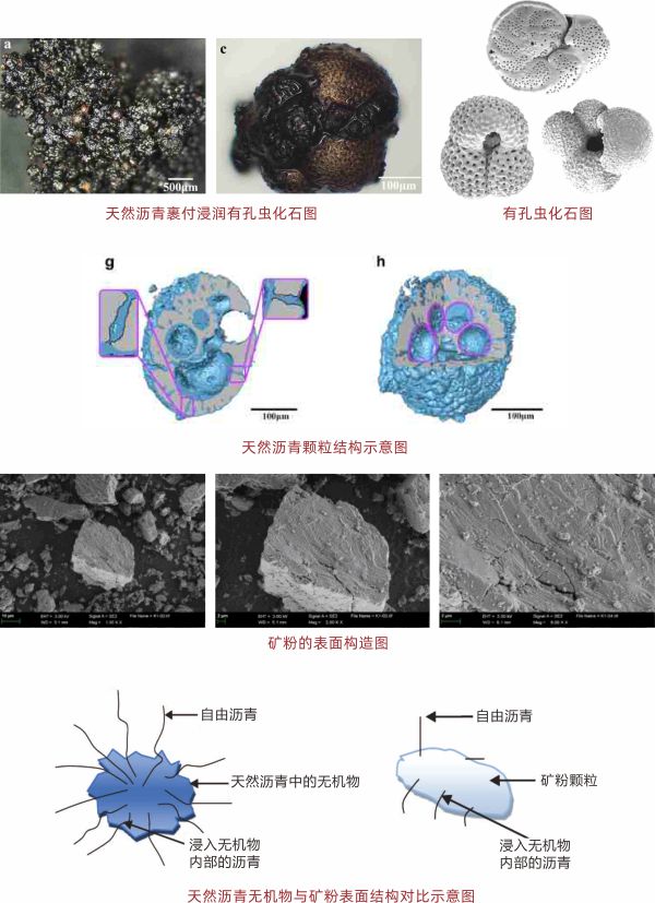 天然瀝青中的無機(jī)物顆粒和礦粉區(qū)別很大,礦粉表面致密,相對(duì)較為光滑,而天然瀝青無機(jī)物其實(shí)是有孔蟲的化石,表面疏松粗糙,且多孔,內(nèi)部有腔體,有通道連接表層和內(nèi)部腔體之間。