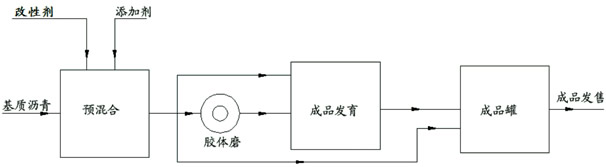 改性瀝青的生產(chǎn)裝置由帶有導(dǎo)熱油加熱盤管的生產(chǎn)罐、攪拌器、膠體磨和成品罐等組成?;|(zhì)瀝青進(jìn)入預(yù)混罐加溫后達(dá)到設(shè)定溫度加入一定量的改性劑,在罐頂攪拌器的攪拌作用下,改性劑分散到瀝青中;預(yù)混后的物料經(jīng)膠體磨系統(tǒng)研磨分散后進(jìn)入成品發(fā)育罐(按照不同工藝,物料也可不經(jīng)膠體磨);在成品發(fā)育罐內(nèi),物料在一定條件下反應(yīng)發(fā)育得到性能穩(wěn)定合格的改性瀝青產(chǎn)品,然后送入成品儲(chǔ)罐;裝車銷售。其生產(chǎn)工藝流程簡(jiǎn)圖見下圖。